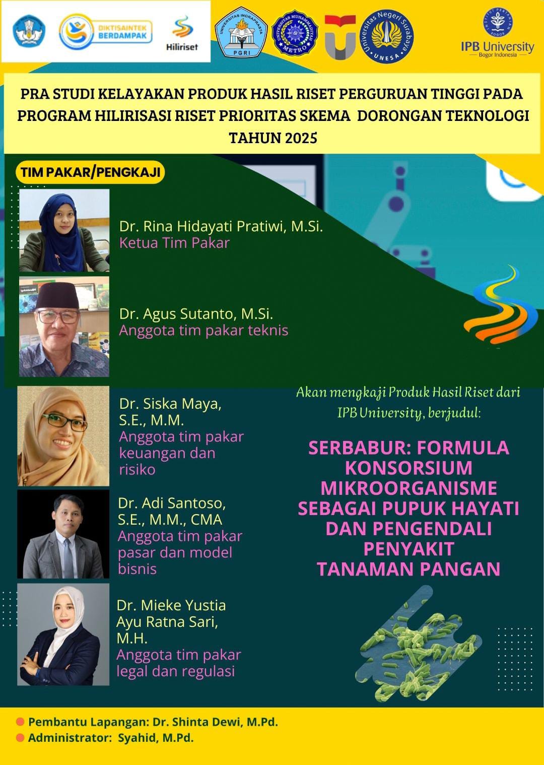 Produk yang dikaji kali ini adalah SERBABUR (Formula Konsorsium Mikroorganisme sebagai Pupuk Hayati dan Pengendali Penyakit Tanaman Pangan) hasil penelitian IPB University. SERBABUR merupakan inovasi berbasis bioteknologi yang memanfaatkan bakteri Burkholderia cepacia, Serratia marcescens, dan Bacillus thuringiensis. Formula ini terbukti mampu melarutkan fosfor, menambat nitrogen, dan menghambat cendawan patogen penyebab antraknosa pada tanaman pangan.