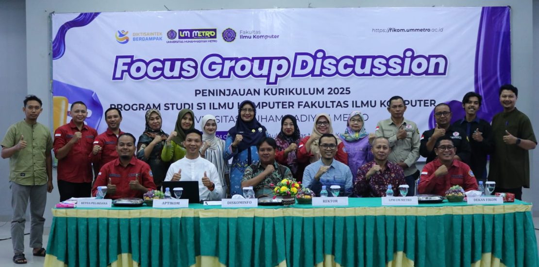 UM Metro, 24 Oktober 2025 – Aula Gedung KH Mas Mansyoer, Lantai 3 Kampus 3 Universitas Muhammadiyah Metro, menjadi saksi bisu sebuah perhelatan penting dalam dunia pendidikan tinggi. Pada hari yang cerah ini, Fakultas Ilmu Komputer UM Metro menggelar Focus Group Discussion (FGD) bertema “Peninjauan Kurikulum 2025 Program Studi S1 Ilmu Komputer”. Acara ini dihadiri oleh berbagai pihak, termasuk narasumber terkemuka dari APTIKOM Lampung dan Dinas Komunikasi dan Informatika (Diskominfo) Kota Metro, serta melibatkan stakeholder dan alumni yang memiliki kepedulian terhadap perkembangan kurikulum, Tamu undangan , Wakil Rektor 1 Bidang akademik dan sumber daya manusia (SDM), Dekan Fakultas , Dosen S1 ilmu komputer dan panitia acara.