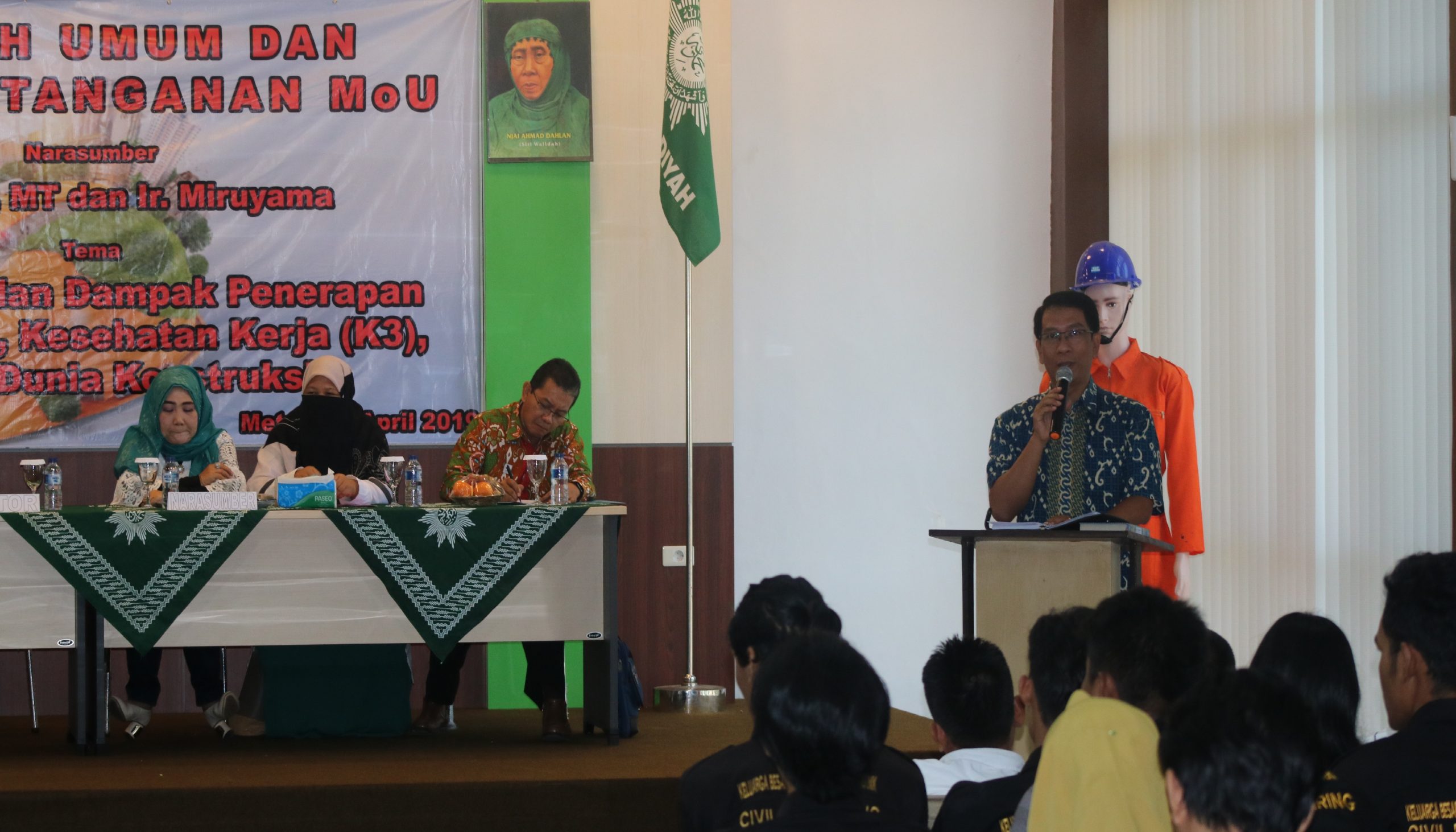 Kuliah umum dengan topik Pengenalan dan Dampak Penerapan K3 Dalam Dunia Kontruksi, di isi oleh dua narasumber yang pakar dibidangnya. Keduanya adalah Ir. Sugito, MT dan Ir. Miruyama. Masing-masing memaparkan pengalamannya selama bergelut dibidang konstruksi bangunan. Seperti mengenalkan manfaat dan fungsi dari Keselamatan, Kesehatan Kerja (K3) dihadapan ratusan perserta kuliah umum. (Nas/Hum).