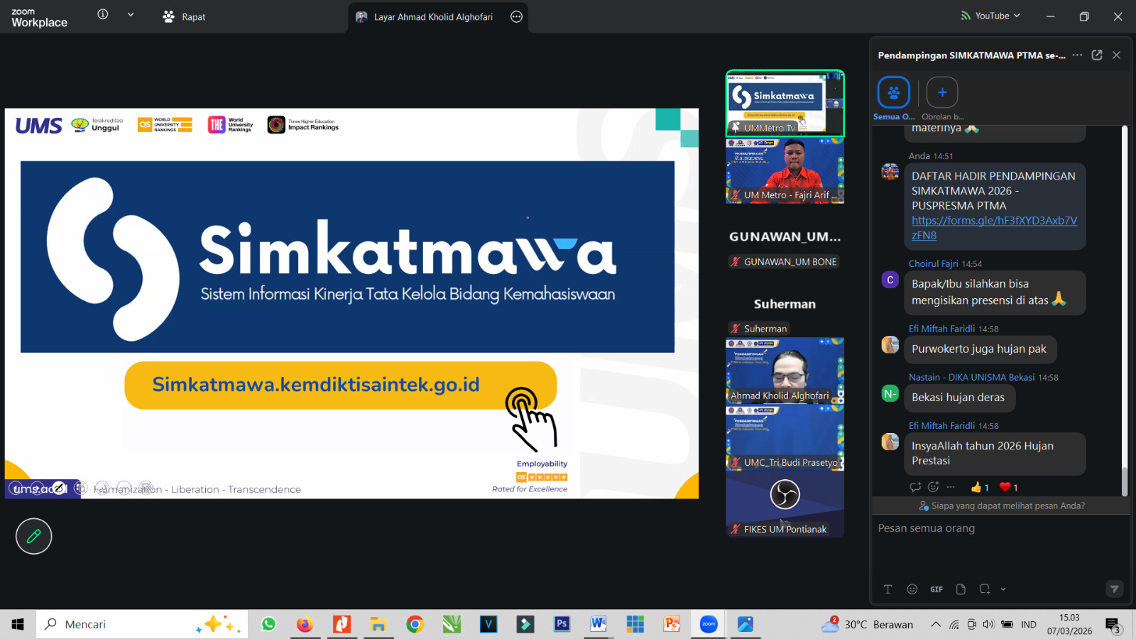 “Pengelolaan SIMKATMAWA tidak bisa hanya bergantung pada satu operator. Diperlukan kerja tim yang solid mulai dari tingkat universitas hingga program studi agar setiap aktivitas mahasiswa dapat terdokumentasi dengan baik,” paparnya.