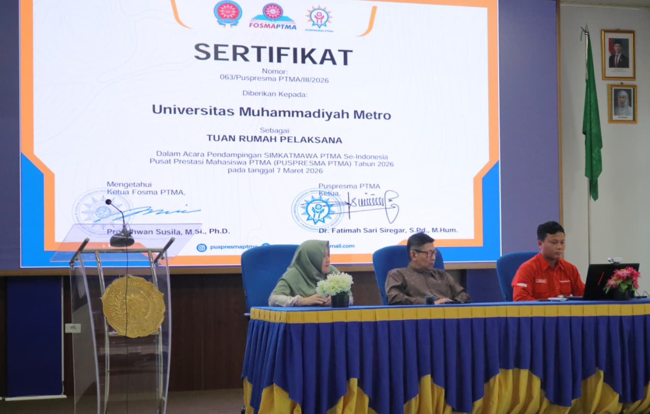 Metro – Universitas Muhammadiyah Metro menjadi tuan rumah kegiatan Pendampingan Pengisian Sistem Informasi Manajemen Kemahasiswaan (SIMKATMAWA) bagi Perguruan Tinggi Muhammadiyah dan ‘Aisyiyah (PTMA) se-Indonesia Tahun 2026. Kegiatan tersebut digelar pada Sabtu (7/3/2026) di Aula AR. Fachruddin UM Metro dan diikuti peserta secara luring maupun daring melalui Zoom.