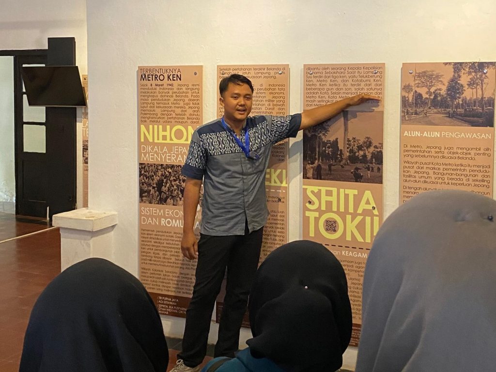 Metro, 06 Oktober 2024 – Program Studi Pendidikan Sejarah UM Metro melakukan Kegiatan Pelatihan Tour Guide (Walking Tour & Workshop Tour Guide/LokaKarya Pencapaian profil Lulusan Mahasiswa) pada hari Jum’at-Sabtu, 4-5 Oktober 2024. Kegiatan ini di ikuti oleh 62 orang peserta dari Mahasiswa Pendidikan Sejarah. Acara ini dimulai dengan kegiatan Walking Tour di hari Jum’at sore, setelah itu dilanjutkan di hari Sabtu, dengan menghadirkan pemateri dari Kaprodi Pendidikan Sejarah Bapak Dr. Johan Setiawan, M.Pd dan Tim Ahli Cagar Budaya Kota Metro Bapak Dr. Oki Hajiansyah Wahab, M.H.