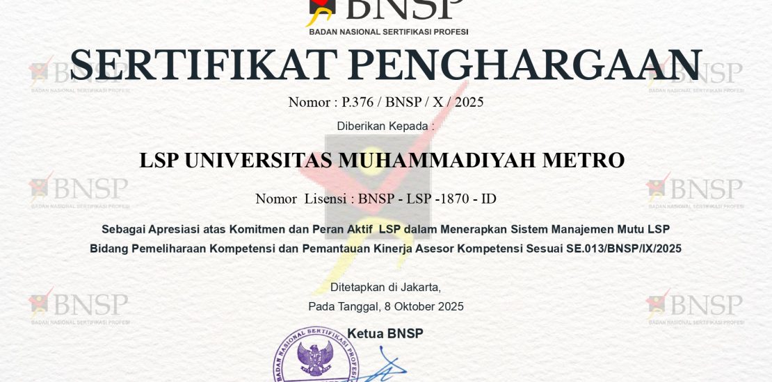 LSP UM Metro Raih Sertifikat Penghargaan dari BNSP atas Komitmen dalam Pemeliharaan Kompetensi